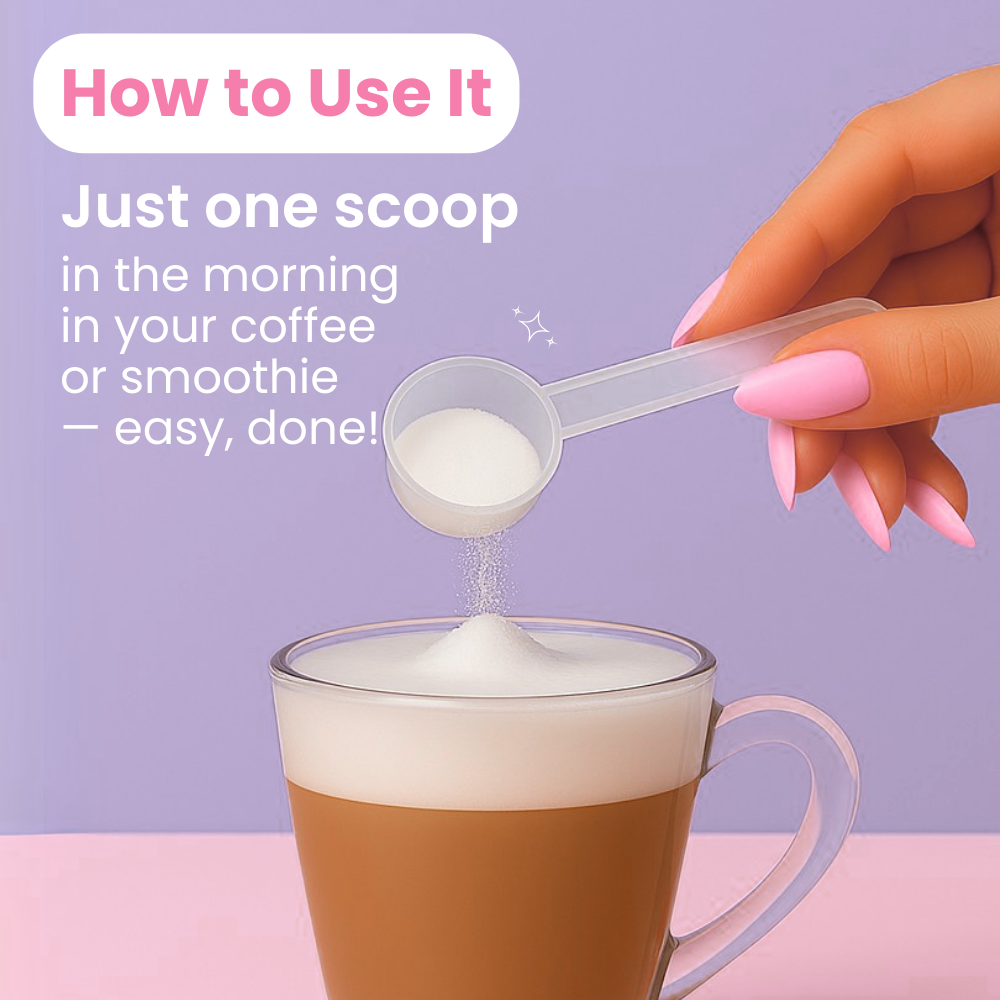 Just one scoop a day! Mix it into your morning coffee, smoothie, or even yogurt. It’s unflavored, dissolves easily, and blends right into your rhythm.