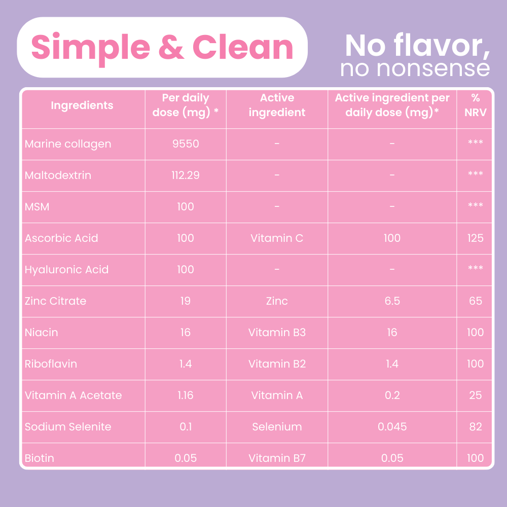 - Pure & Clean - Premium marine collagen + key nutrients. No fillers, no fluff.
